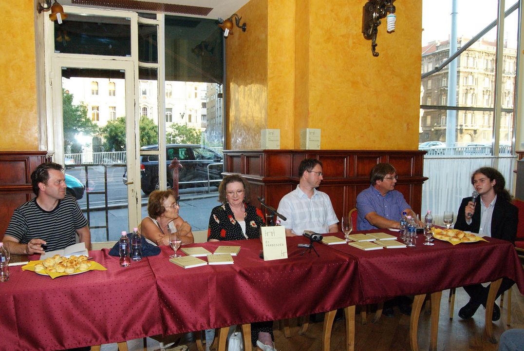 Asztali beszélgetések - Öt párbeszédKönyvbemutató alkalmunk a Pilinszky Caféban... Balról: Oberfrank Pál, Heller Ágnes, Jókai Anna, Csepregi András, Fabiny Tamás és Galambos Ádám Dokumentummal kapcsolatos tevékenységek |